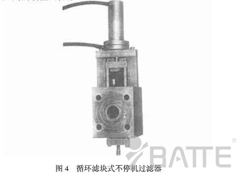 新型熔體換網(wǎng)過濾器在國內(nèi)的開發(fā)應用較晚,上世紀八十年代年國內(nèi)一些企業(yè)才研制出帶料壓傳感報警系統(tǒng)和高壓污料泄荷系統(tǒng)的循環(huán)濾塊式不停機換網(wǎng)過濾器(圖4),該機可在佳時機報警更換濾網(wǎng),使換網(wǎng)時機選擇可準確量化,防止錯換和漏換而且還能使主體總壓力比同類產(chǎn)品降低30%-50%,在美、德、日、奧、韓等國進口的BOPP,CPE,EPE,塑料拉絲,彩印復膜生產(chǎn)線上配套使用證明安裝簡便,易操作,性能穩(wěn)定可靠。
